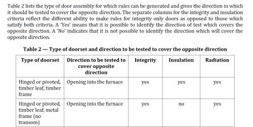 For example, Table 2 of test standard BS EN 1634-1 allows for this known predictability. Timber doorsets are typically tested opening towards the furnace as their performance characteristics can be reliably assessed without the need for testing in both directions.